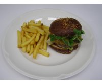 Zvěřinový hamburger + hranolky (domácí bulka i maso) Zvěřinový hamburger + hranolky (domácí bulka i maso)